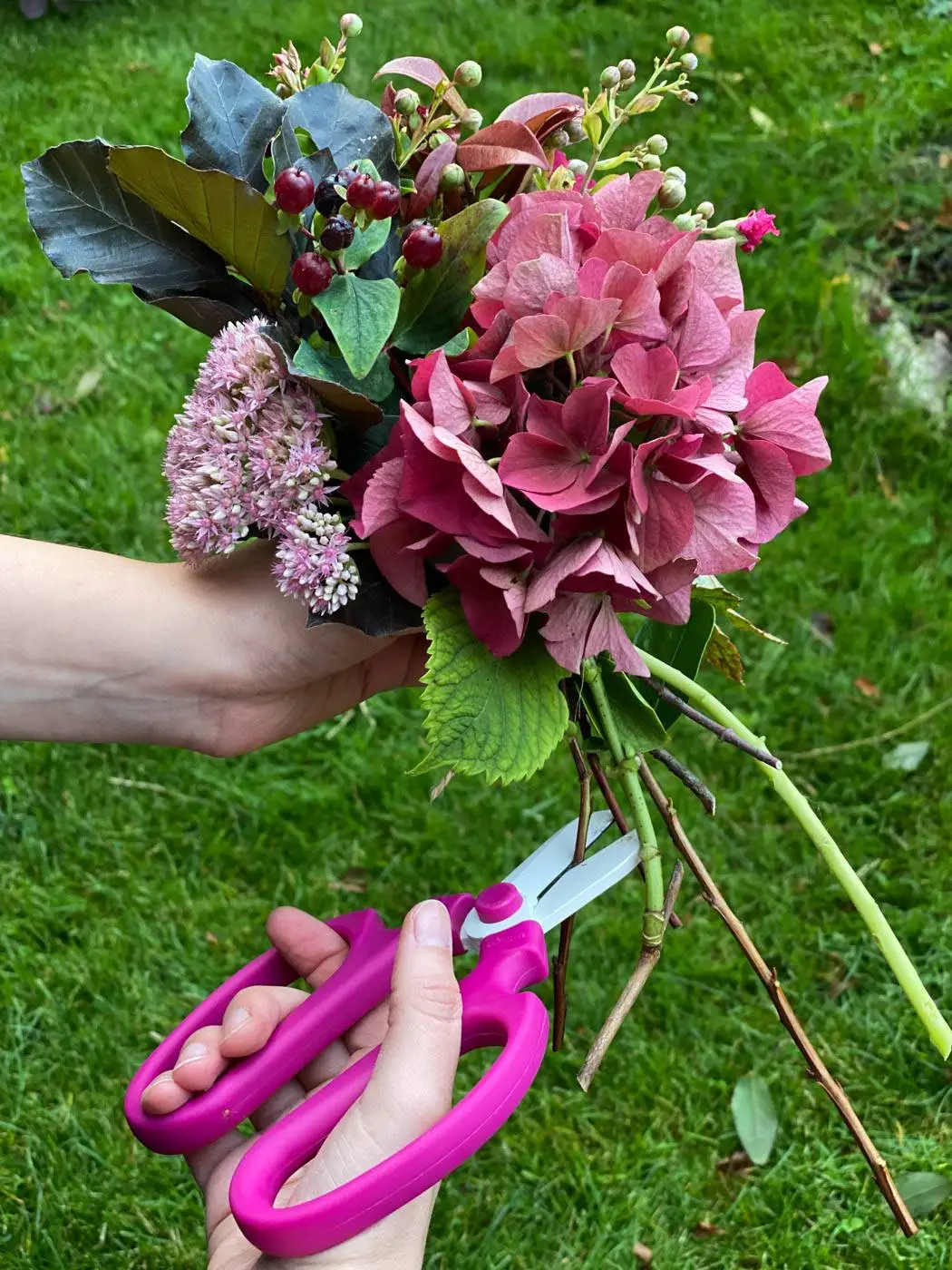 En attendant que le feuillage des arbres s’enflamme et que je puisse enfin avoir de la matière pour mes projets créatifs, j’utilise ce que j’ai sous la main. Et je ne suis pas en manque de fleurs et de feuillage au mois de septembre. Bien au contraire ! Les dahlias donnent toujours de belles fleurs, les anémones s’expriment pleinement et les fameux hortensias ornent quelques massifs et nous offrent de beaux contrastes. Et leur couleur qui vire au grenat annonce le changement qui est sur le point d’arriver…