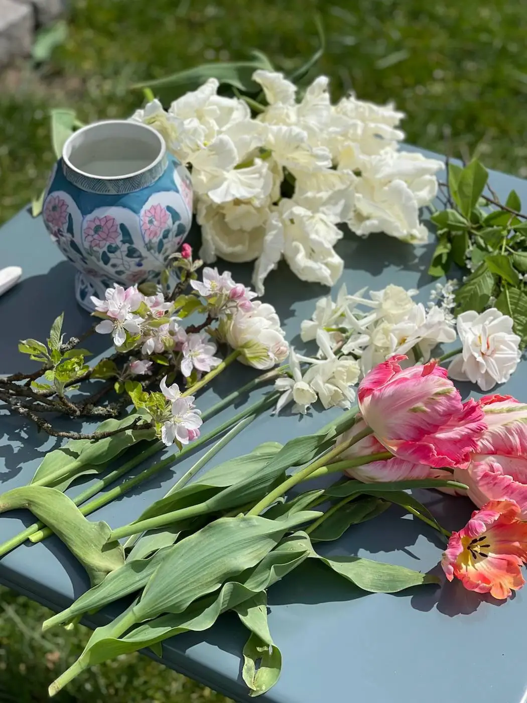Comme pour la majorité des bouquets, j’ai puisé mes ressources dans le jardin pour un effet très printanier que j’ai accentué en utilisant quelques branches de pommier. J’aime beaucoup ces arbres fruitiers, leur simplicité rustique et leur beauté au printemps et à l’automne. Ils me font toujours penser à Anne Shirley de la Maison aux Pignons Verts, et, lorsque je peux utiliser quelques branchages pour un bouquet, je n’hésite pas ! Nous avons planté l’année dernière un pommier d’ornement « Everest » et j’ai tellement hâte de le voir grandir pour en apprécier sa beauté mais aussi pour garnir mes bouquets d’automne…