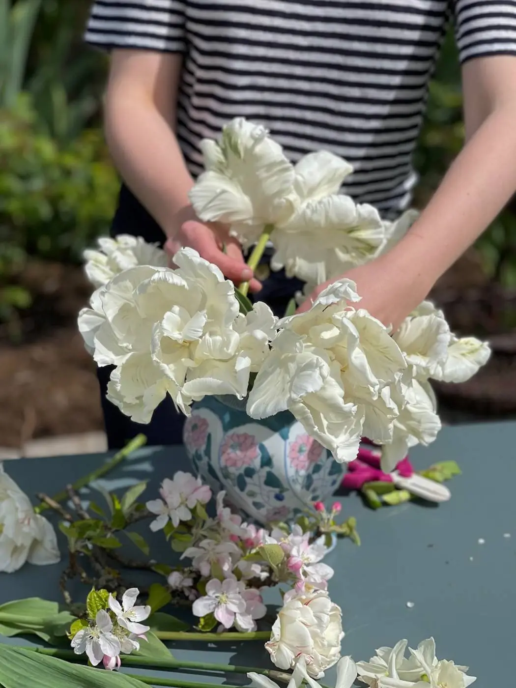Ajoutez quelques branches de pommier en fleurs pour donner un effet champêtre et romantique au bouquet. J’aime énormément apporter une petite touche campagne et rustique avec des branchages de fruitiers à des bouquets qui pourraient avoir l’air trop « précieux ». Cela apporte aussi une légèreté et permet également d’accrocher le regard sur autre chose que les tulipes (qui ont déjà une belle place dance ce bouquet !).