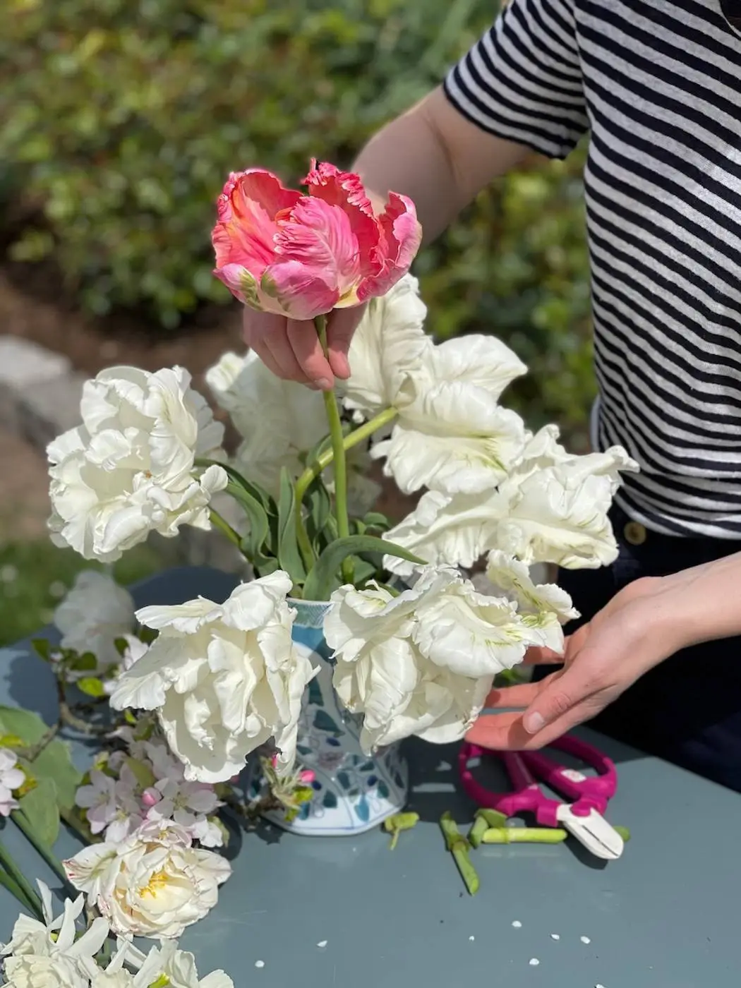 Pour créer ce bouquet de tulipes dans les tons clairs, je me suis inspirée des tons blancs, roses et verts de ce contenant que j’utilise comme vase.