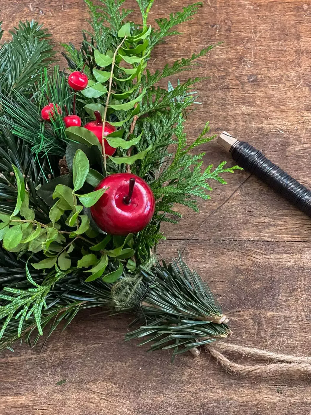 N’oubliez pas les parties qui pendront de chaque côté : vous pourrez y fixer des éléments comme des pommes de pin à l’aide de tiges métalliques, mais n’incorporez pas des objets que vous ne pouvez pas attacher dessus car ils risqueraient de tomber. Par exemple, mes fruits givrés sont simplement piqués dans la guirlande et je ne les incorporerai pas sur les parties pendantes.