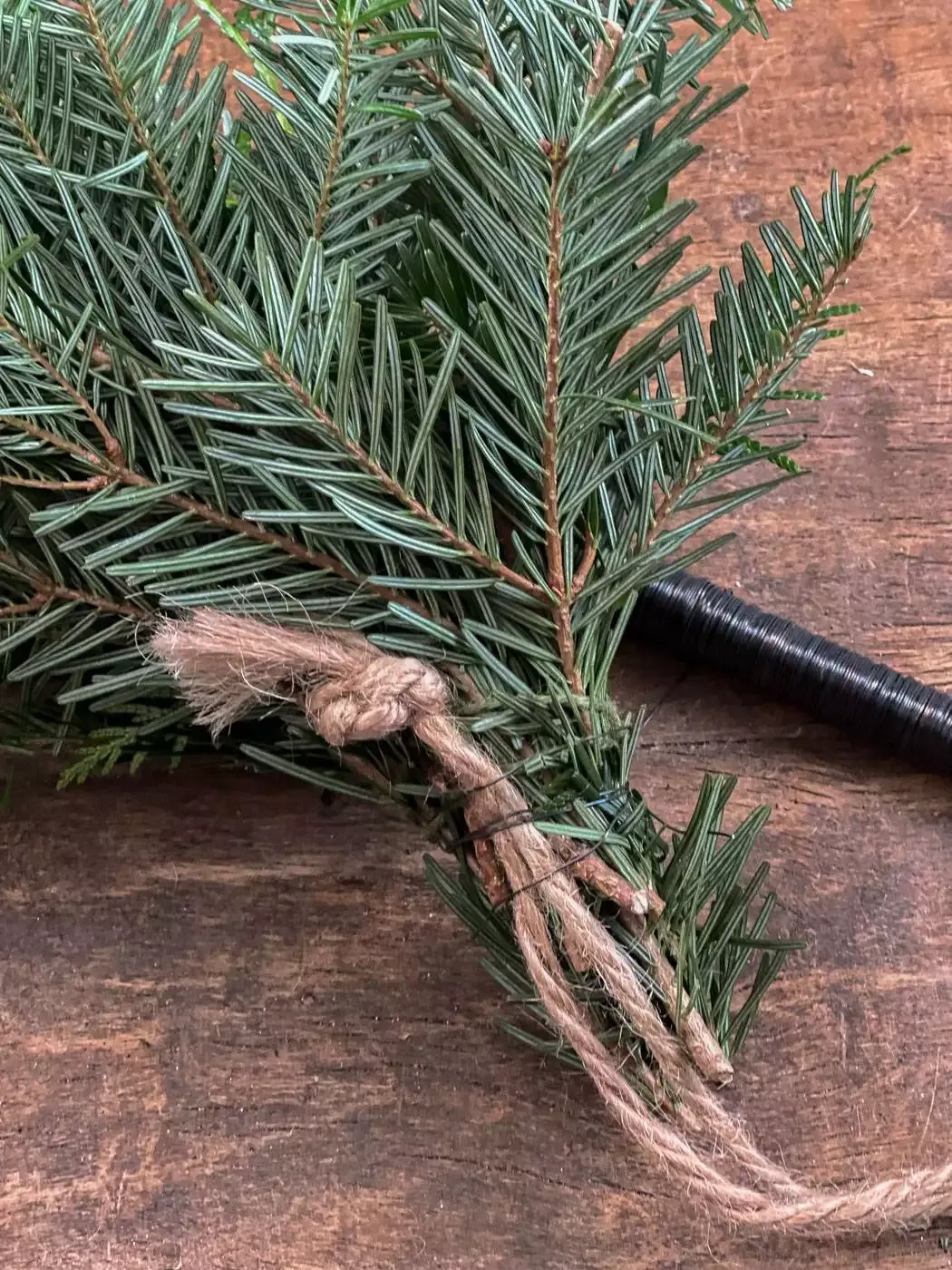 Commencez par prendre vos grandes branches de sapin et taillez dedans afin d’obtenir plusieurs branchettes entre vingt et trente centimètres chacune. Comme pour les couronnes, l’idée pour réaliser une guirlande est de créer une multitude de bouquets plats en dessous mais ayant du volume au-dessus. Contrairement aux couronnes, les bouquets peuvent être beaucoup plus gros et denses selon l’effet souhaité. Je vous conseille également de les réaliser en variant les éléments (même si on conserve une certaine cohérence). Ainsi, vous allez commencer par créer un bouquet avec des branches de sapin, de thuya et des baies. Pour le suivant, vous prendrez la même base (sapin, thuya) mais vous remplacerez les baies par une belle tête d’hortensia. Pour un autre, vous n’utiliserez que de la verdure… et ainsi de suite.