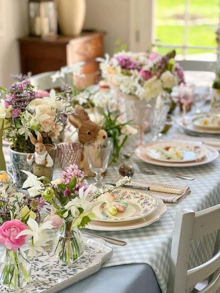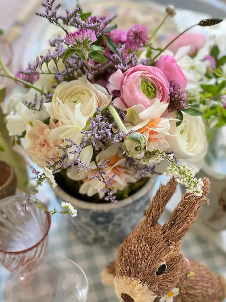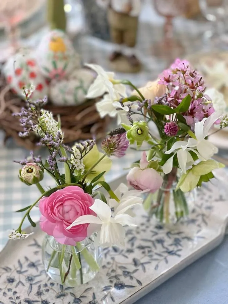 Alors, comment dresser une jolie table de Pâques ? Pour ce petit-déjeuner, nous dressons une jolie table assez simple avec quelques bouquets de fleurs et de la jolie vaisselle mais rien de défini, pas de thème particulier contrairement à la table qui sera dressée pour le déjeuner qui aura lieu vers le milieu de l’après-midi. Et c’est celle-ci dont je vous parle aujourd’hui.