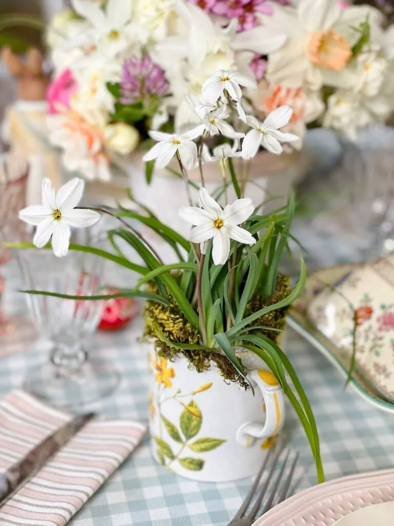 Pour un effet très printanier, je me suis aussi amusée à placer des ipheions Alberto Castillo dans de jolis mugs de style champêtre. On y ajoute un peu de mousse sur le dessus et l’effet est charmant ! Mais attention, c’est très bien pour une décoration temporaire (pas plus de deux heures) et après il est impératif de les planter… C’était tellement tentant car le rendu apporte un côté frais et une certaine candeur parmi les bouquets champêtres. Une petite composition qui fera sans aucun doute sourire vos invités !