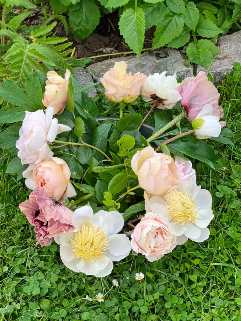 Lorsque les tulipes terminent leur floraison, ce sont les pivoines qui prennent le relais, bientôt suivies par les pavots et les roses, souvent presque en même temps. Cela me laisse toujours un certain laps de temps pour composer de beaux bouquets. À cette période de l’année, j’ai aussi la chance d’avoir un large choix de couleurs dans le jardin, ce qui me permet de créer des compositions dans des tonalités variées. Pour celui-ci, j’ai opté pour des teintes douces, des tons pastel qui offrent une sensation d’apaisement, contrairement à un autre petit bouquet que j’ai réalisé quelques jours plus tard, dans des tonalités plus vives, et qui a donc un peu plus de caractère.