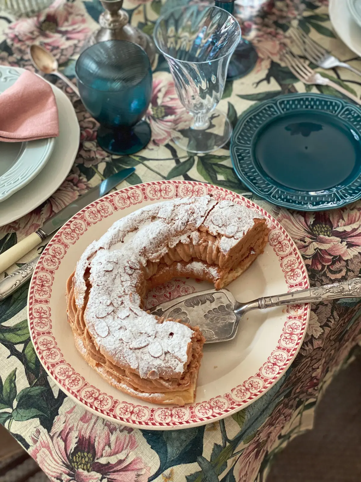 Si vous souhaitez dresser une table semblable au début de l’automne (l’avantage avec les dahlias étant qu’ils fleurissent de nombreuses semaines et permettent de décorer différents styles de tables), vous pouvez servir un délicieux Paris-Brest comme un avant-goût de la saison. Je craque souvent à la rentrée pour ce gâteau au délicieux goût noisette qui est l’un de mes péchés mignons, annonçant une autre saison riche en saveurs et en couleurs…