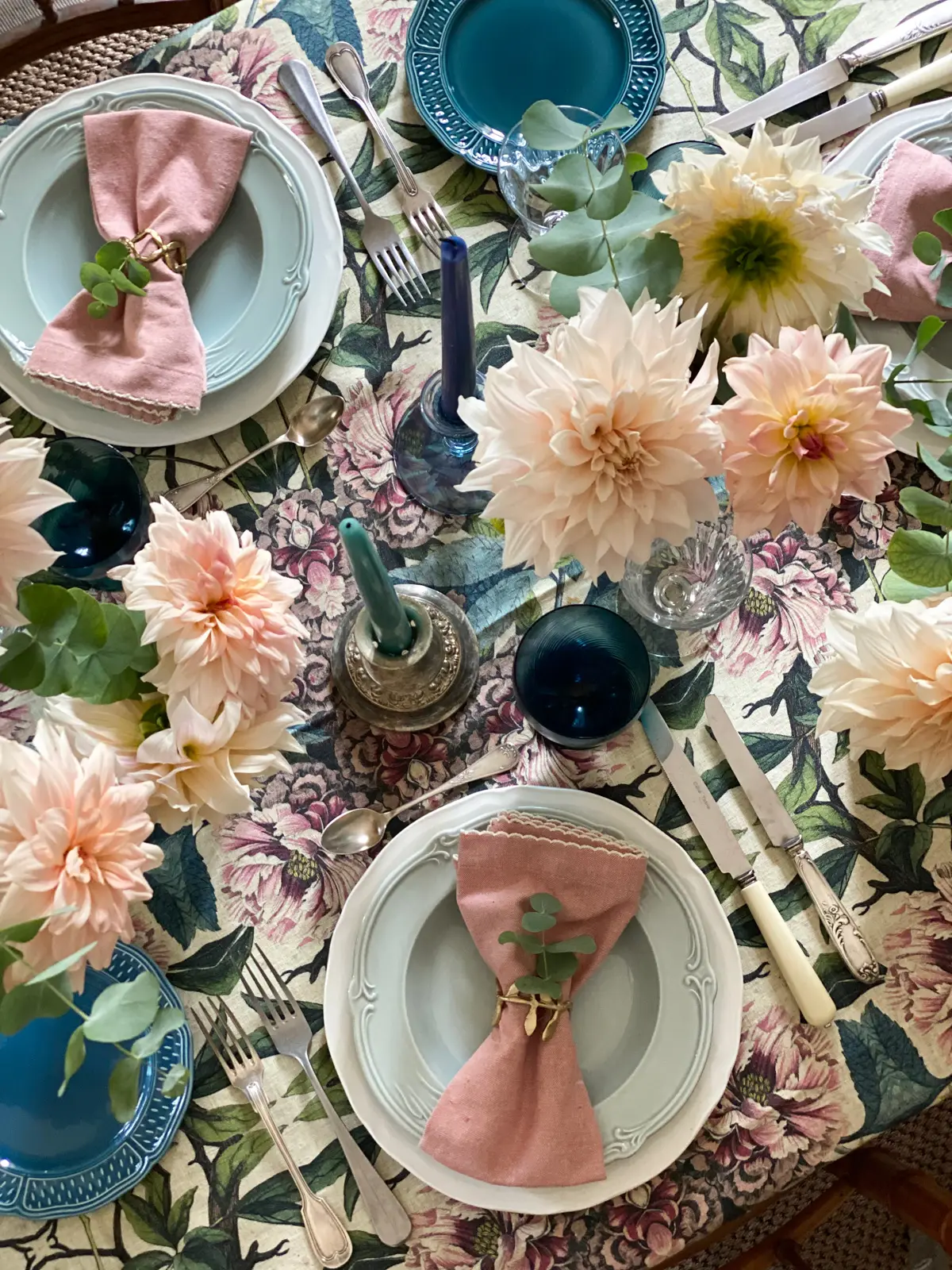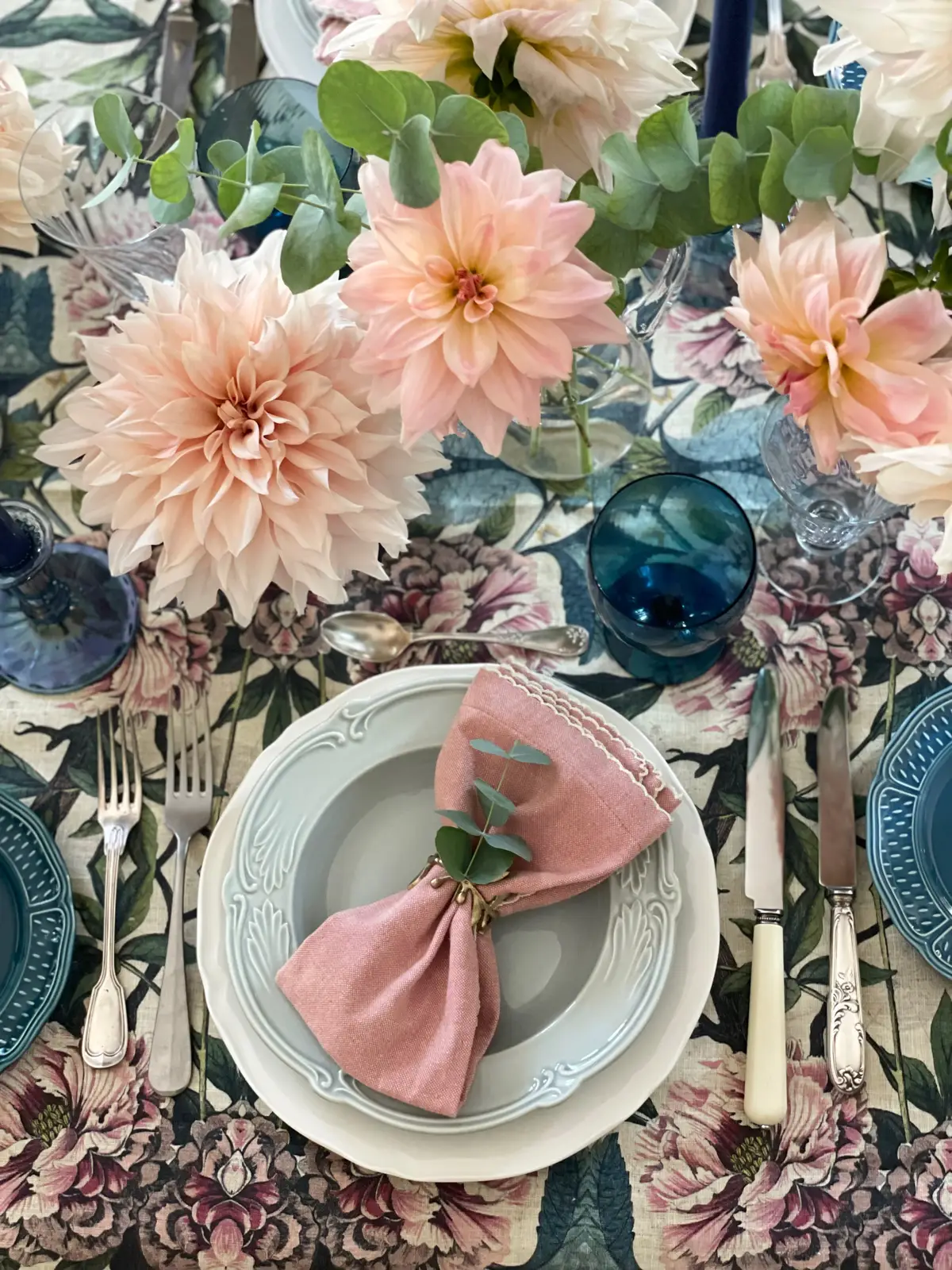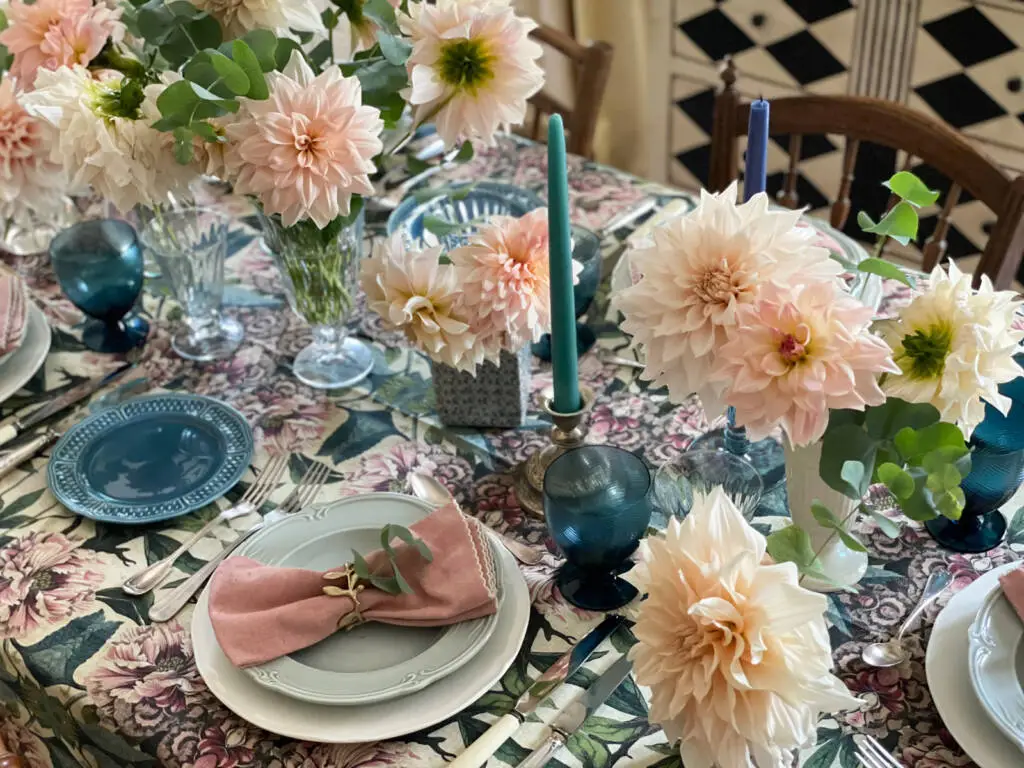 Deux éléments principaux attirent le regard sur cette table : les bouquets (plutôt monochromes donc avec les dahlias Café au Lait, auxquels j’ai associé quelques branches d’eucalyptus) et cette fameuse nappe que j’aime sortir à cette époque de l’année. Elle est tellement chargée visuellement qu’elle apporte non seulement beaucoup de caractère à la table mais je lui trouve aussi un coté cosy, très chaleureux qui permet d’utiliser de la vaisselle simple, dans des tons pastels, ce qui atténue l’ensemble. Vous pourrez bientôt retrouver sur le blog une variante de table avec cette même nappe pour un goûter champêtre dans un jardin.