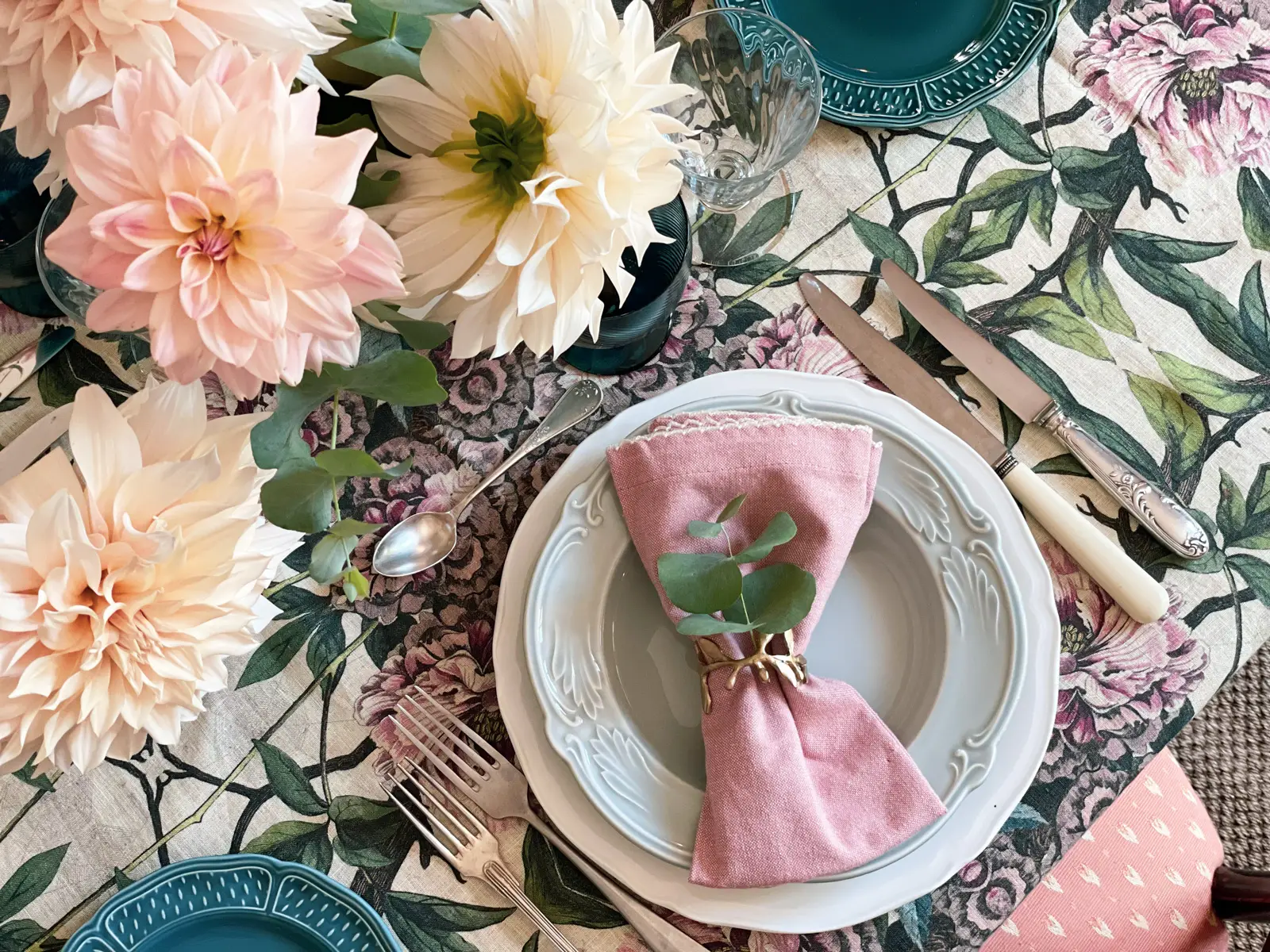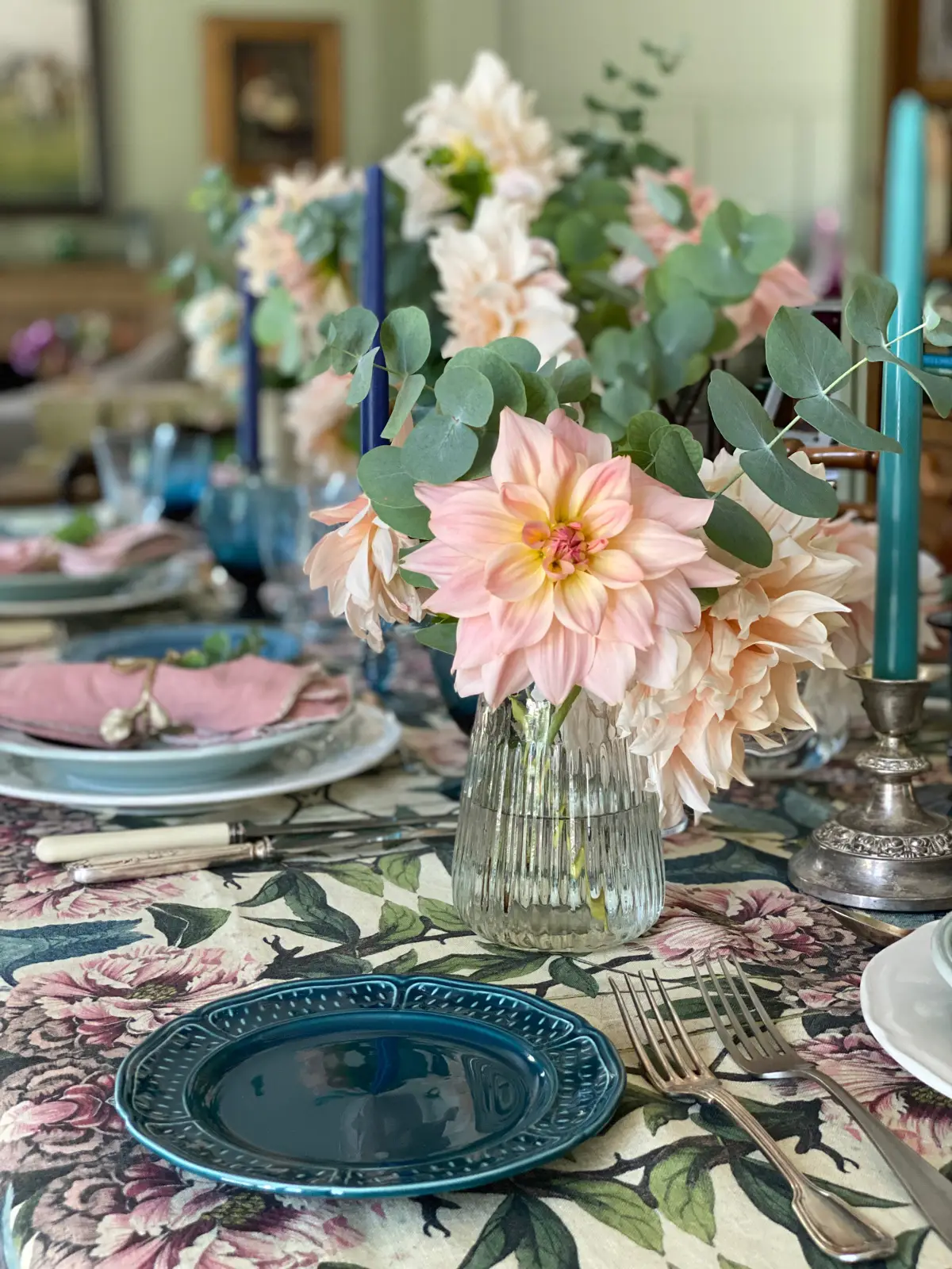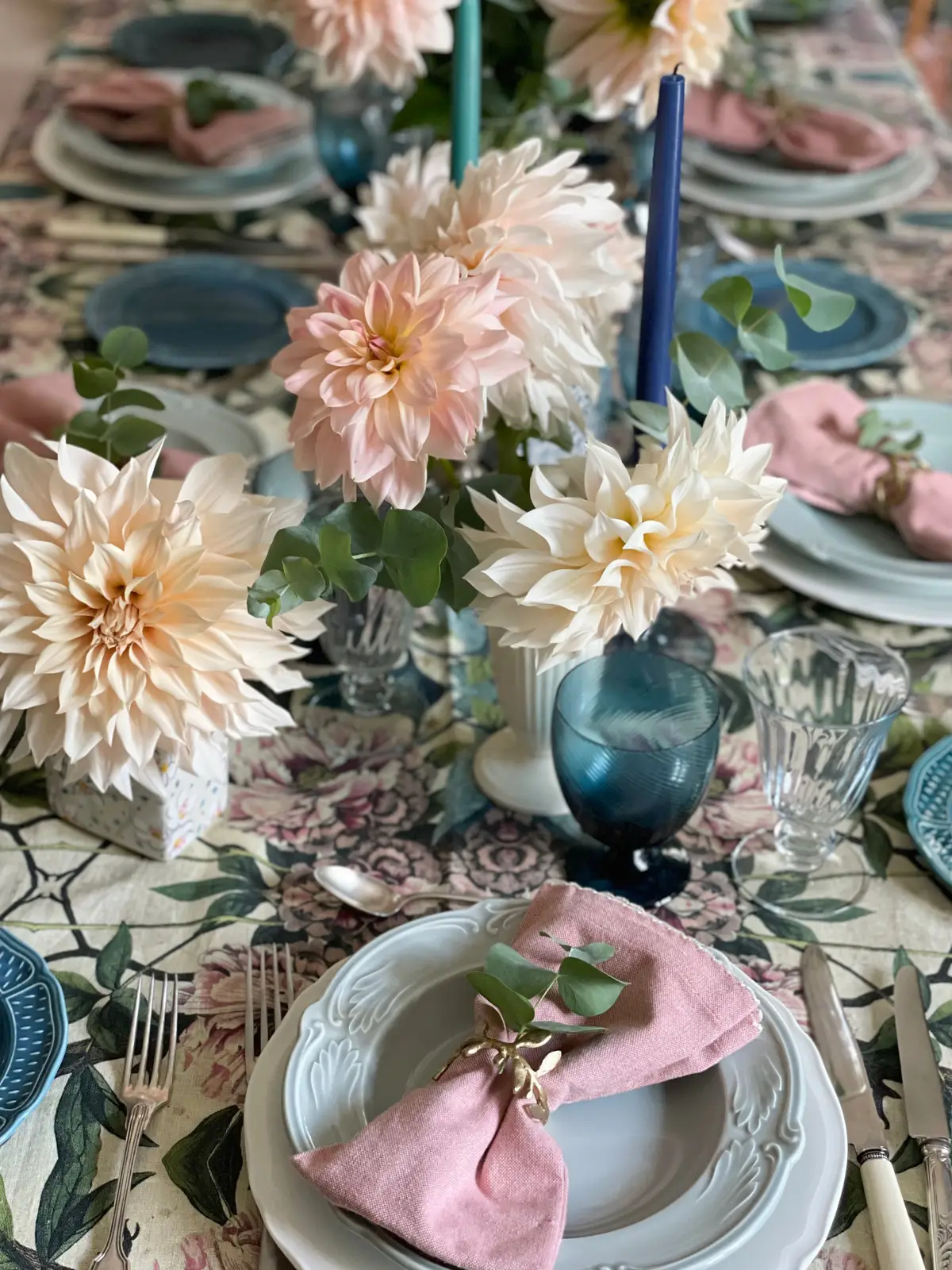 Deux éléments principaux attirent le regard sur cette table : les bouquets (plutôt monochromes donc avec les dahlias Café au Lait, auxquels j’ai associé quelques branches d’eucalyptus) et cette fameuse nappe que j’aime sortir à cette époque de l’année. Elle est tellement chargée visuellement qu’elle apporte non seulement beaucoup de caractère à la table mais je lui trouve aussi un coté cosy, très chaleureux qui permet d’utiliser de la vaisselle simple, dans des tons pastels, ce qui atténue l’ensemble. Vous pourrez bientôt retrouver sur le blog une variante de table avec cette même nappe pour un goûter champêtre dans un jardin.
