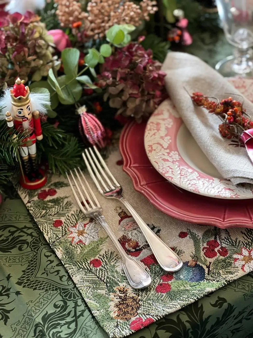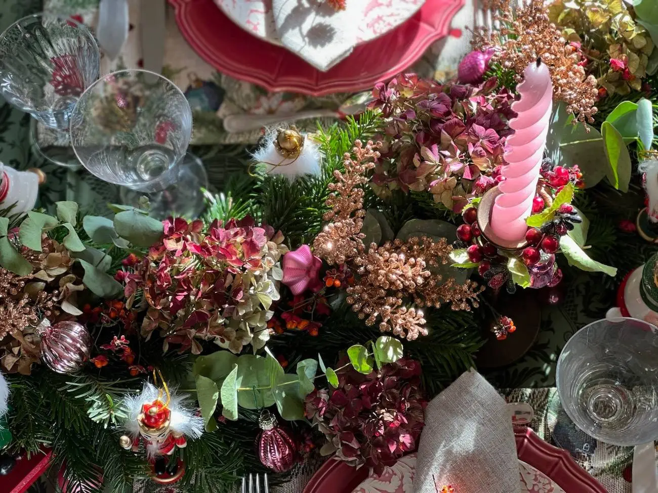 Avant de choisir cette vaisselle française dans les tons roses, j’avais décidé d’utiliser comme point de départ une guirlande de table / centre de table dans deux tons principaux qui sont le vert et le rose. Si vous souhaitez faire votre propre centre de table comme je l’ai fait ici, suivez ce tutoriel. Ce sont principalement des éléments naturels qui m’ont servi tels que des branches de sapin, d’eucalyptus, des baies roses provenant tous du jardin et que j’ai ensuite « fournies » avec des ornements et des petites branches pailletées roses.