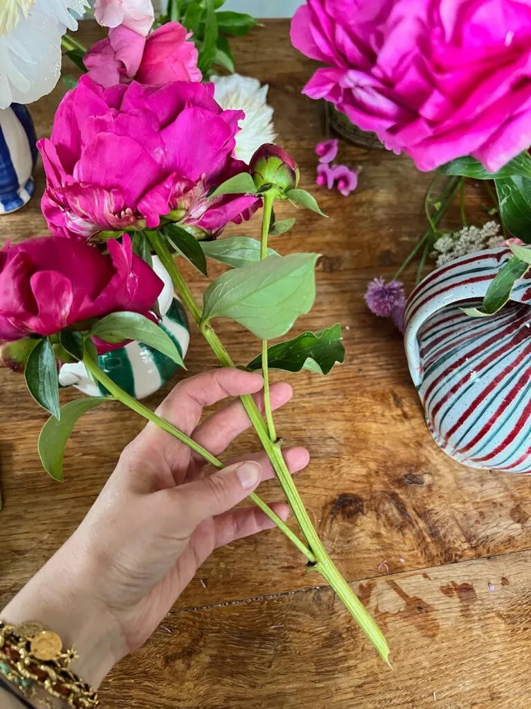 J’ajoute ensuite des fleurs plus légères, comme les roses, en retirant bien sûr les feuilles (celles des pivoines aussi, à l’étape précédente) ainsi que les épines. Je coupe toujours les épines, car je réutilise souvent les fleurs ensuite dans un plus petit vase, et cela évite de me blesser en les recoupant.
